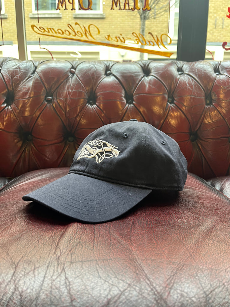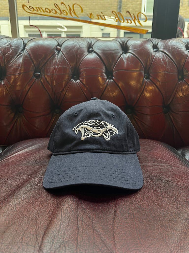Celtic dog design on a navy dad cap, designed by Ben Ford.