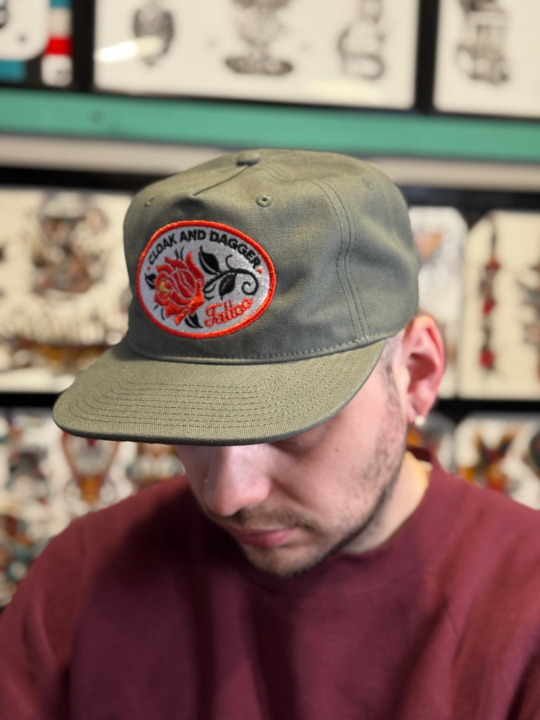 Grren Cloak and Dagger Rose Snapback cap, designed by Aiden Knowles https://www.instagram.com/aidenknowlestattoo/